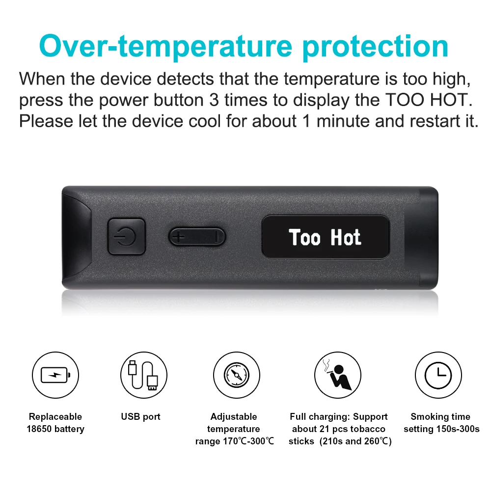 | Smoking time: | 150-300 seconds; | Battery capacity: | replaceable 18650 battery; |