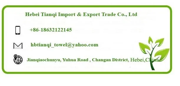 Hebei Tianqi Import & Export Co.,Ltd is located in the city of shijiazhuang, Hebei provience. Our company has the most advanced technology and production equipment and a professional production team. We mainly produce baby towels, sports towels, car wash towels, kitchen towels,hair towels, bath towels,face and hand towels etc. We can also produce a variety of series of products with different textures, specifications, models and colors according to our customers' requirements.