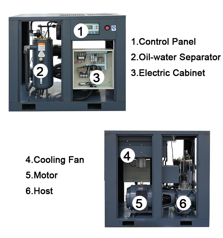 4 .Imported oil filter, oil gas separation filter element, ternary separation, ensure oil content less than 0.001ppm, the trunk adopts metal pipe, safe for long –term operation without leakage or deformation, the V type drive belt is imported from Germany, and has a service life more than10000hous.