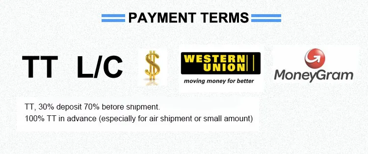 A: Usually FOB, but we also accept CFR and CIF. If under $10,000.00, 100% of the amount should be cleared by T/T. If over $10,000.00, 40% of the total amount should be cleared by T/T ,the balance should be paid within one week before the delivery time.
