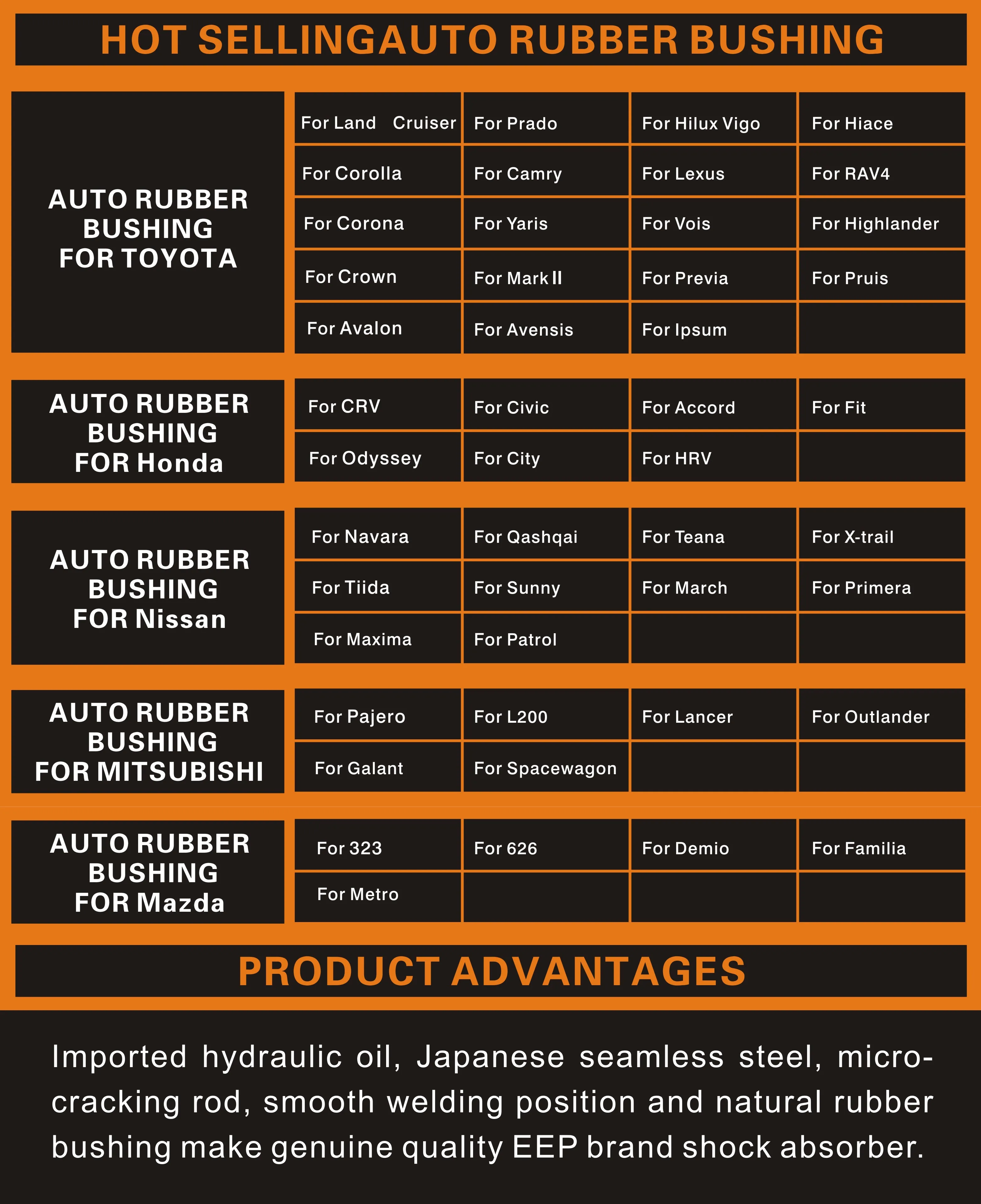 A: 1. Auto rubber bushing: engine mount, shock mount, center bearing, differential mount, control arm bushing, stabilizer bushing, other suspension bushing. 2. Suspension Parts: shock absorber, control arm, ball joint, tie rod end, steering rack. 3. CV joint, drive shaft, cv joint boot. 4. Brake parts: brake pads, brake disc, brake master cylinder, wheel cylinder. 5. fuel pump, water pump, radiator, gasket kit, engine belt. |