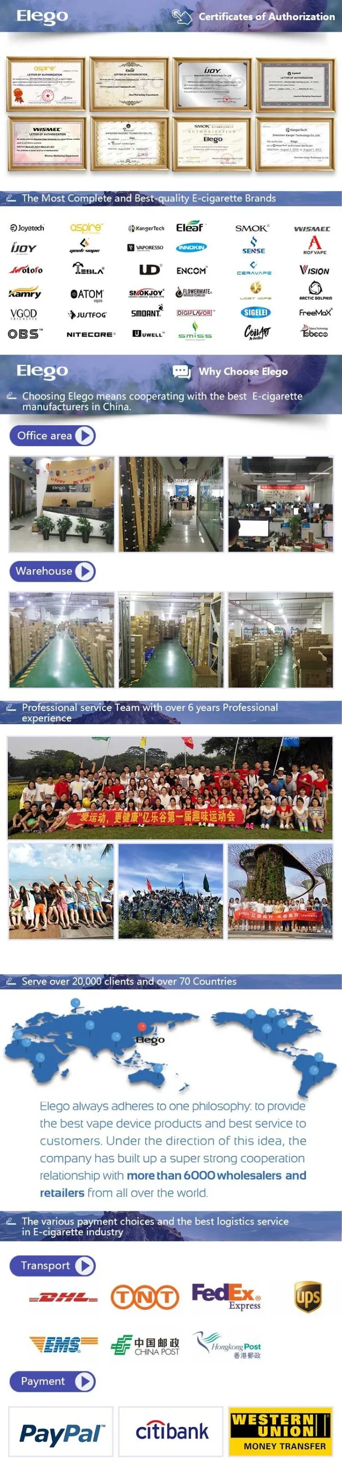 Company Profile: Elego is the biggest franchised agent for great E-cigarettes in China. At present, our company represents brands including Joyetech, Kangertech, Aspire, Ismoka Eleaf, UD, Smok, Innokin, Geekvape, IJOY, Sense, Vaporesso, etc. We are always trying to build up a super strong e-cigarette market with the most complete and the best quality brands for wholesales and retailers from all over the world.
