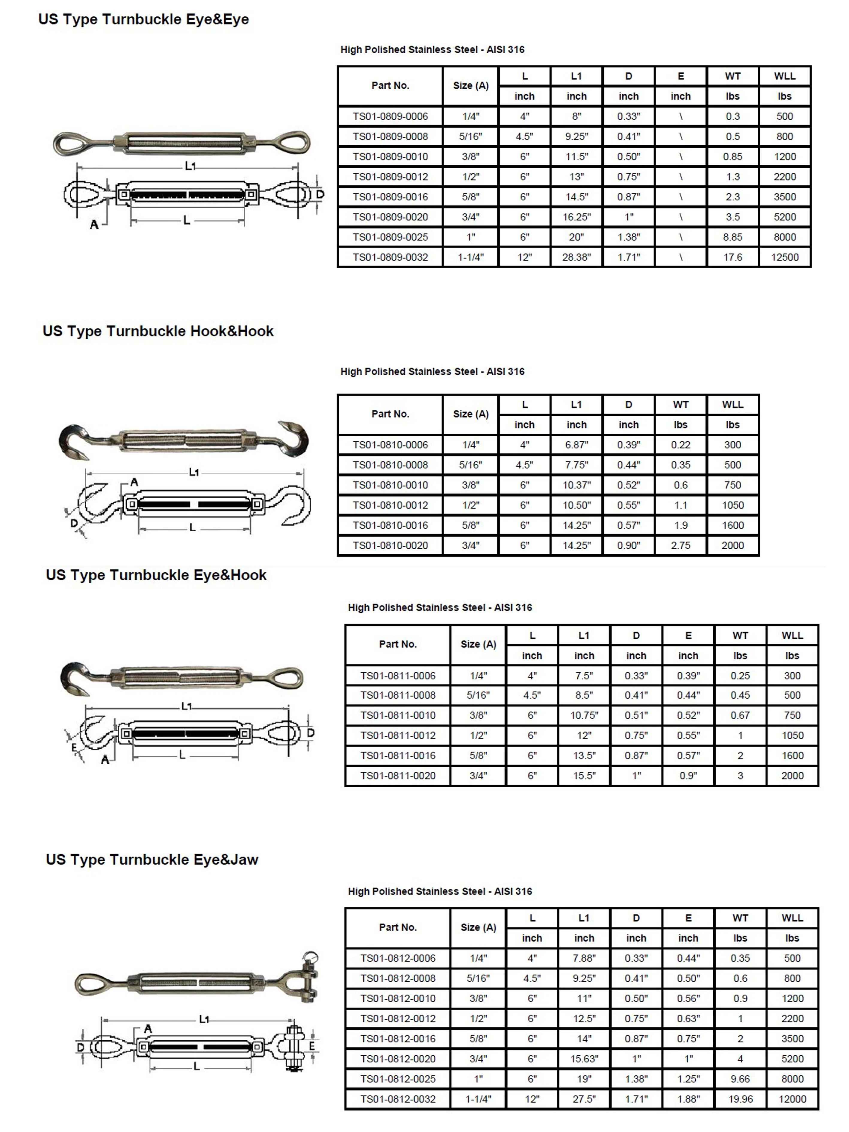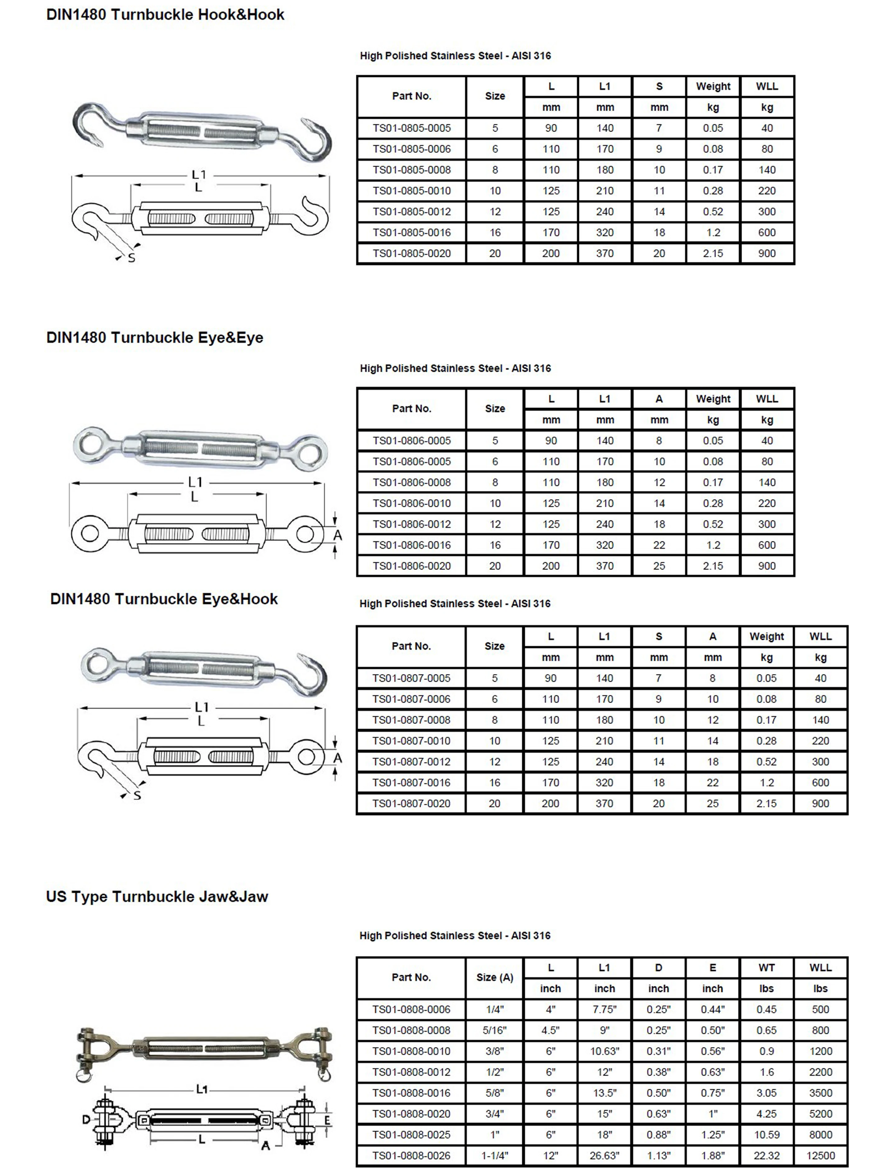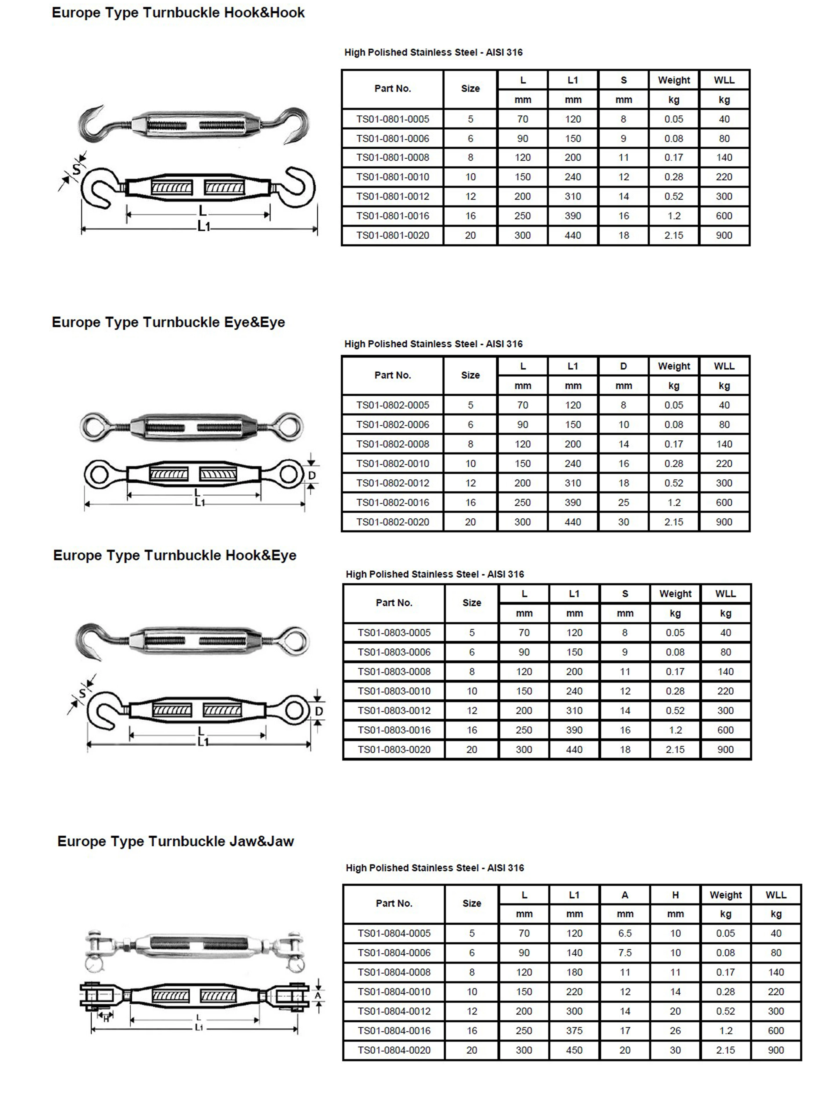 | Turnbuckles body type: | Open body; | Surface: | High Polished; |