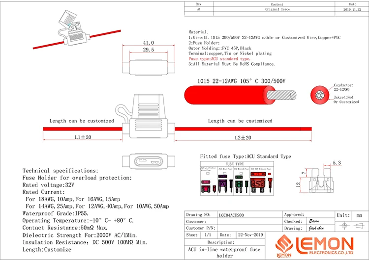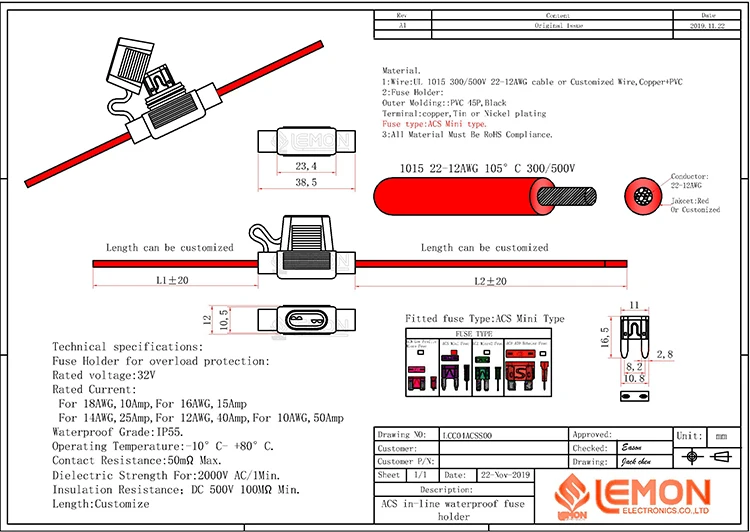Fuse Holder Wire size | 12AWG, 14AWG, 16AWG, 18AWG, 20AWG, 22AWG | ||||||