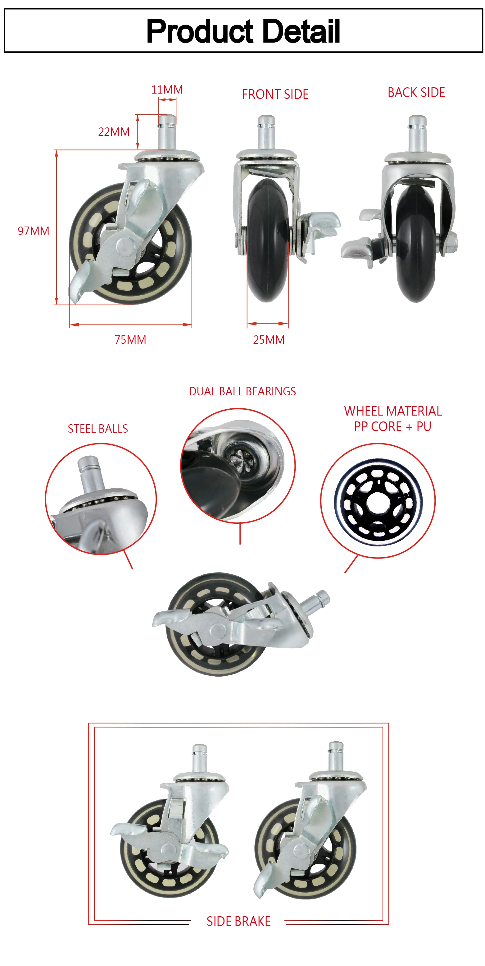 | Stem Size: | 11mm(Dia) X 22mm(H); | Wheel Material: | PP Core + PU Wheel; |