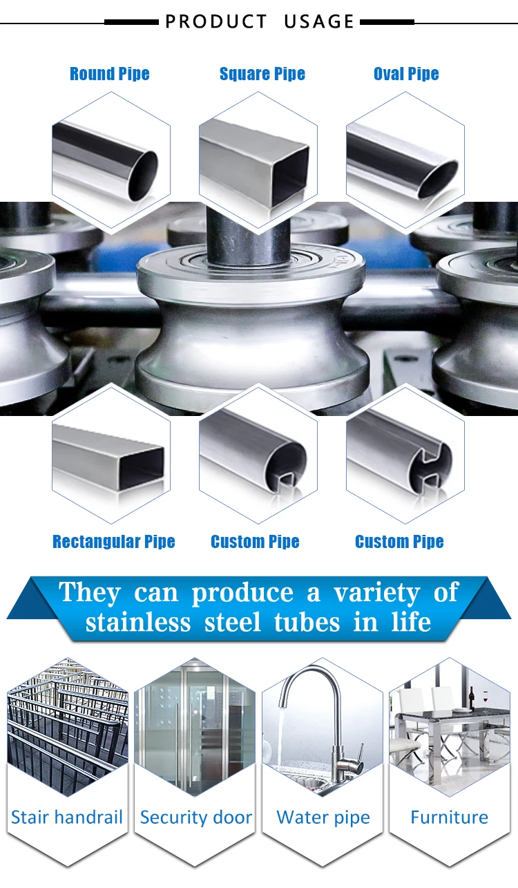 Stainless steel decorative tube mill is mainly used for produing SS pipes for furniture industry, construction industry, home appliances. The machine can produce round tube, square tube, rectangular tube, oval tube ect. It also can produce half pipe, plum pipe and different shaped tube. Main applications including: