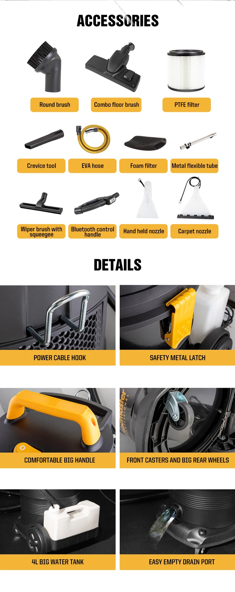 | Accessories Included | round brush, crevice tool, combo floor brush, 2pcs shampoo head(1pc large, 1pc small), 2pcs shampoo sprying nozzle(1pc large, 1pc samll), soap tank, floor nozzle(two squeegee), remote control | round brush, crevice tool, combo floor brush, 2pcs shampoo head(1pc large, 1pc small), 2pcs shampoo sprying nozzle(1pc large, 1pc samll), soap tank, floor nozzle(two squeegee), remote control |