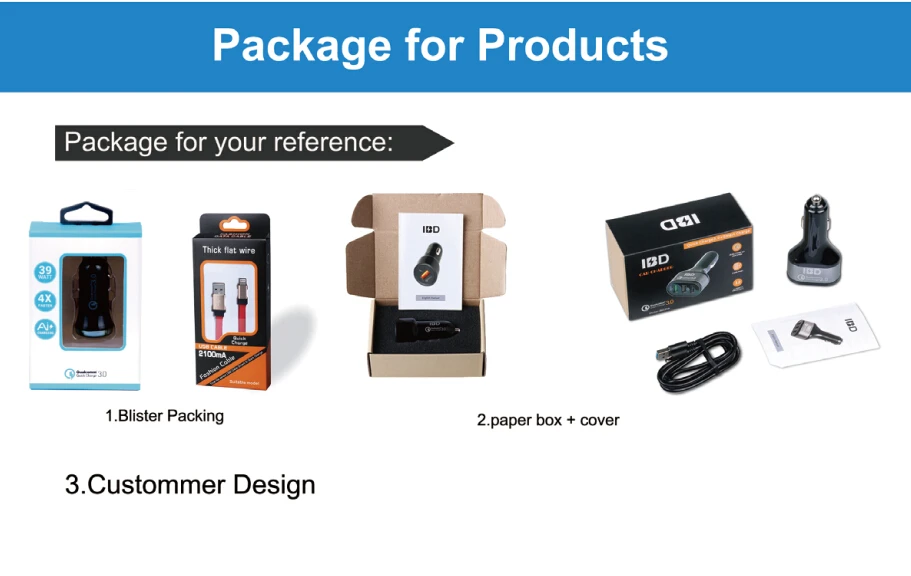 2. We are professional manufacturer for high quality car charger and wall charger, utilizing state-of-the-art technology, including Qualcomm Quick Charge, Type C, PD etc.
