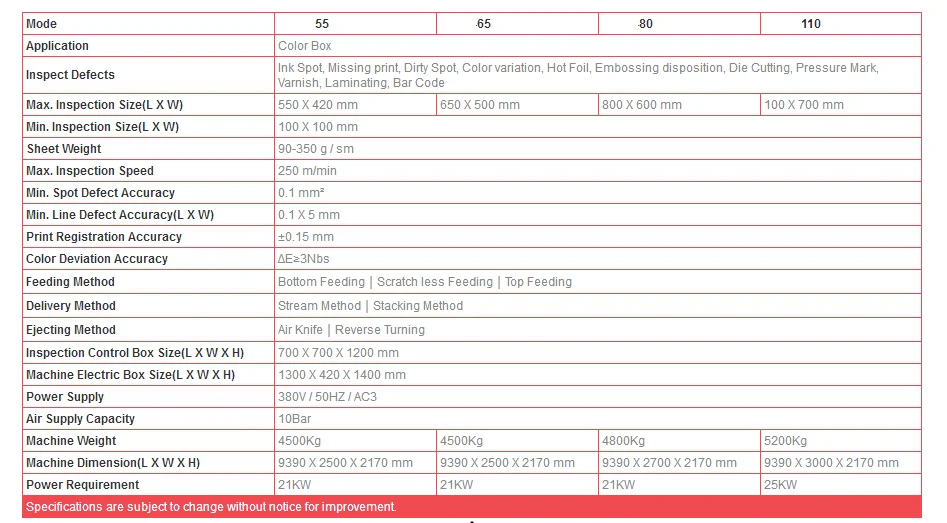 Specially developed for sheet-fed packaging industry, such as, pharmaceutical, tobacco, 3C electronic, cosmetic, food, Tag, Card, liquid packaging etc. It’s versatile function allows accurate inspection of highly-reflective substrates as well as normal ones, for instance gold and silver metalized film paperboard, laser film paperboard, aluminized material and stamping material.It is able to inspect defects like missing print, dirty spot, ink splash, registration, color deviation, streak as well as embossing defects and variable data.