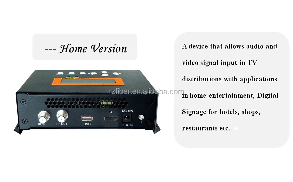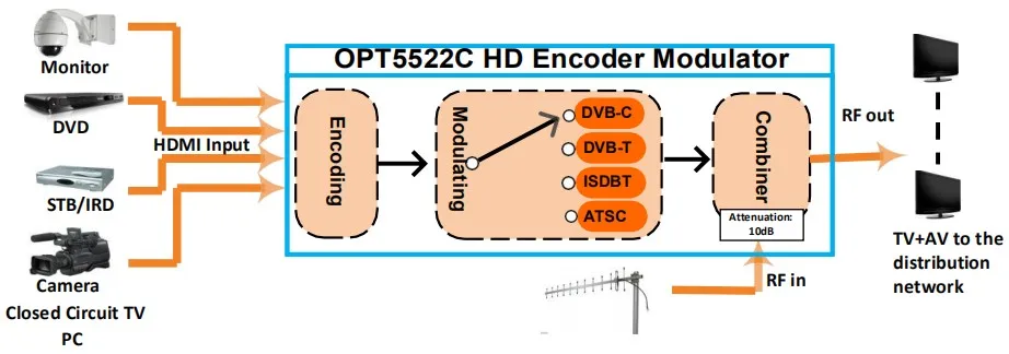 ♥ OPT5522C HD encoder & modulator is designed based on consumer electronics which allow audio/video signal input in TV distributions with applications in home entertainment, surveillance control, hotel Digital Signage, shops etc.