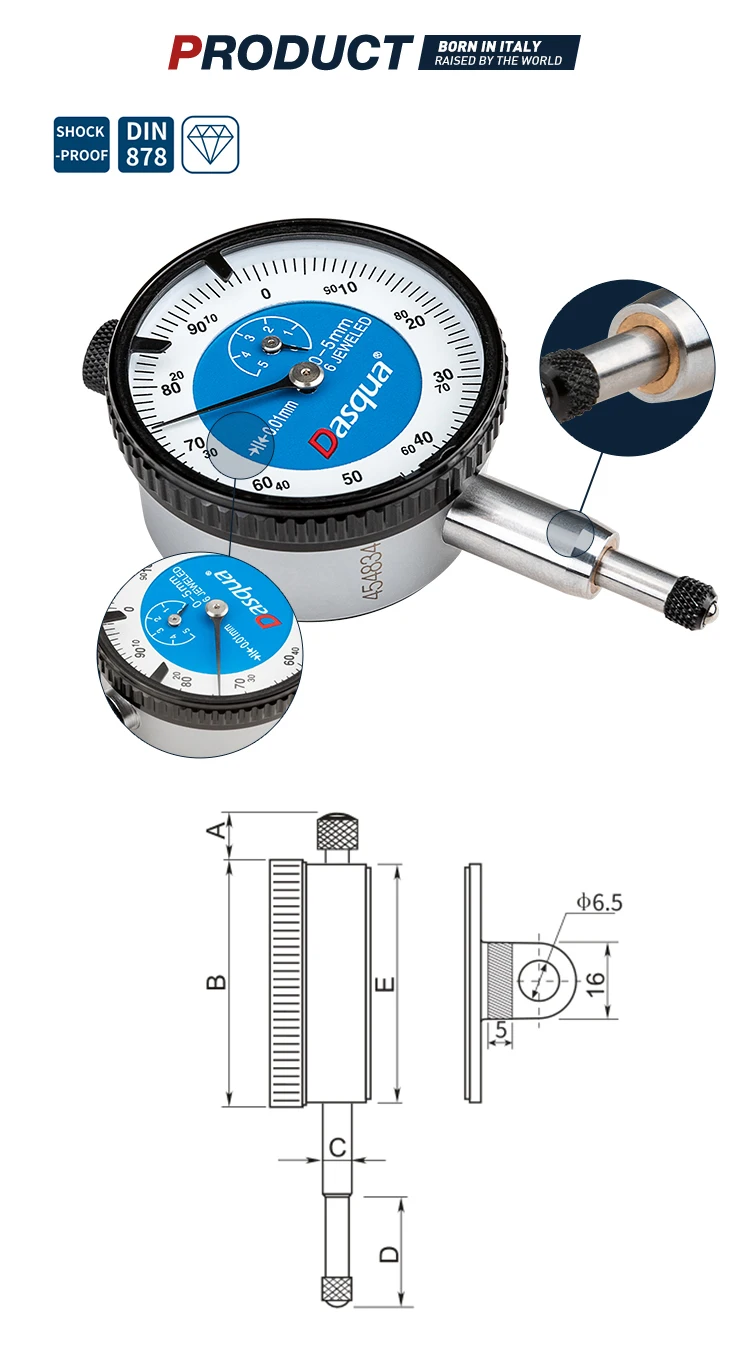 | Product name: | Dasuqa 5mm Jeweled Bearing Shockproof Dial Indicator; | Measuring range: | 0-10mm; |