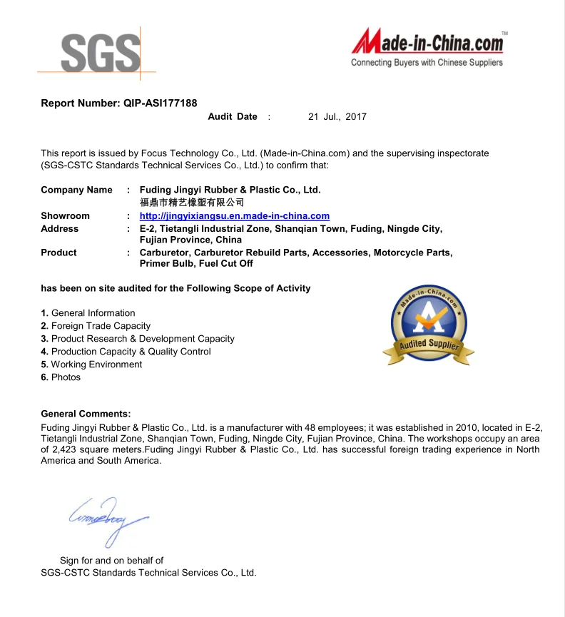 Fuding Jingyi Rubber Plastic Co., Ltd. is located in Fujian, China. Established since 2010.We are a professional manufacturer of motocycle parts, We are specializing in the production of the carburetor and motorcycles engine parts,Garden machinery parts.