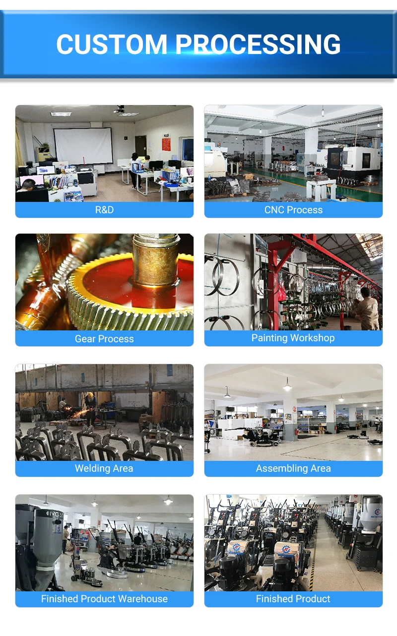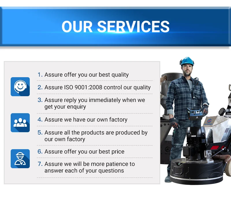 A:Firstly,we have our own factory ,CNC workshop the Core Technology controlled by ourselves.more and more people in the world to use Chinese brand product because the high quality and very good competitive price, we are specialized in producing floor grinding machines since 1999.