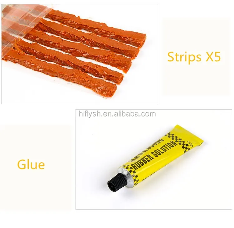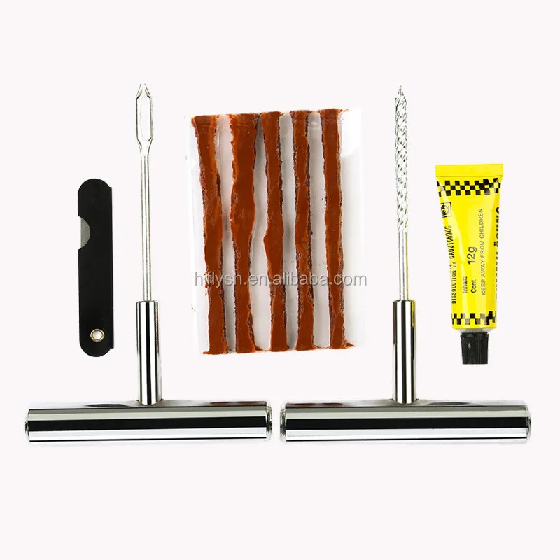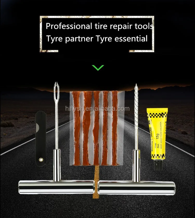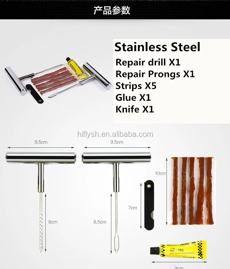 Including: 1* metal tire drill, 1* metal fork drill, 1* tire repair liquid, 1* knife, 5* tire repair glue bar