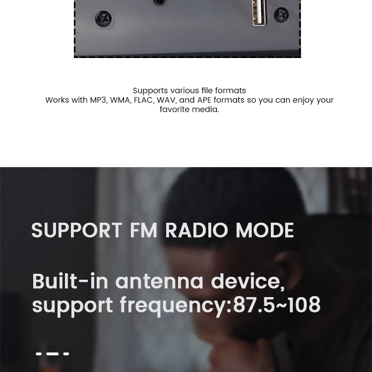 Support USB disk/TF card/3.5mm aux-in jack cable to play music.