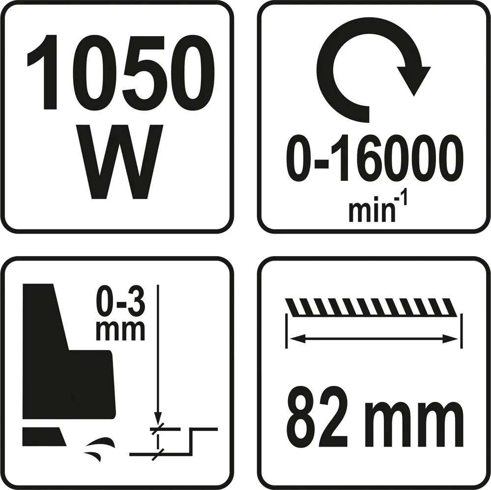 | VOLTAGE/FREQUENCY: 220V/50HZ; RATED INPUT: 1050W; NO LOAD SPEED: 0-16000RPM; ADJUSTABLE CHIP THICKNESS: 0-3MM; SOFT GRIP; AL BASE PLATE; RUBBER VDE CORD WITH VDE PLUG; ELECTROPHORETIC MOUNTING SCREWS |