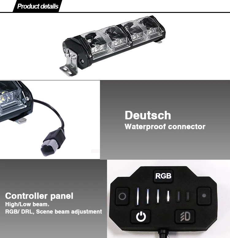 2. All in one light: High beam, low beam, flood beam, spot beam, scene beam , RGB back light, Six level brightness control.