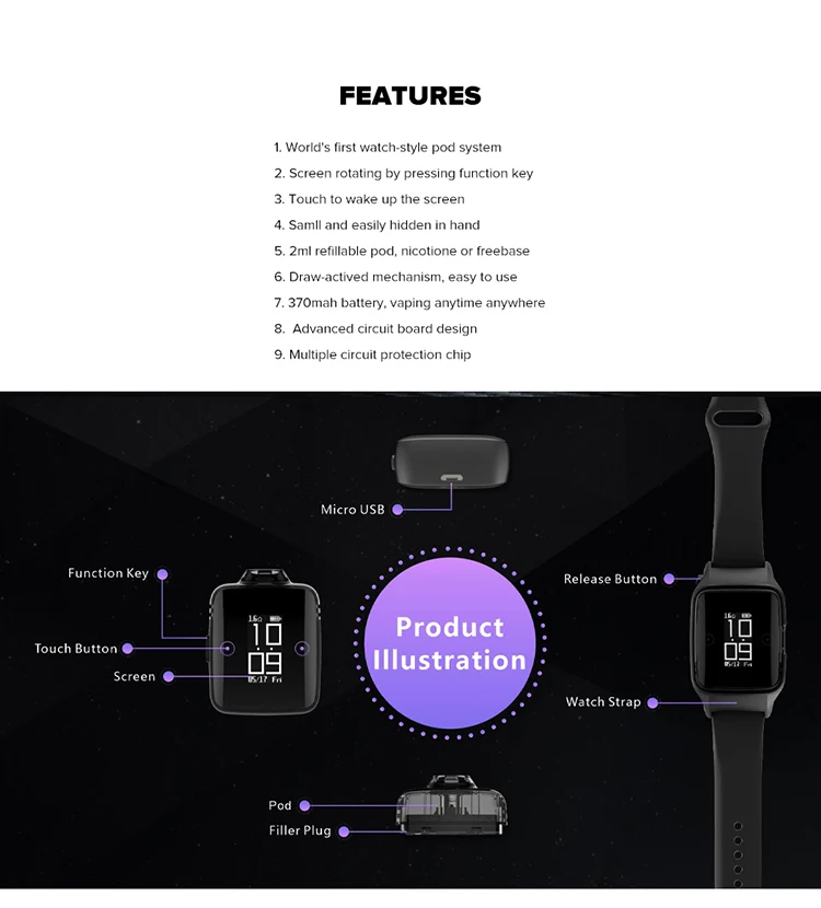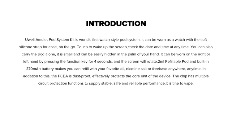 Uwell Amulet Pod System Kit is world's first watch-style pod system, It can be worn as a watch with the soft silicone strap for ease, on the go. Touch to wake up the screen,check the date and time at any time. You can also carry the pod alone, it is small and can be easily hidden in the palm of your hand. It can be worn on the right or left hand by pressing the function key for 4 seconds, and the screen will rotate.2ml Refillable Pod and built-in 370mAh battery makes you can refill with your favorite juice, nicotine salt or freebase anywhere, anytime. In addation to this, the PCBA is dust-proof, effectively protects the core unit of the device. The chip has multiple circuit