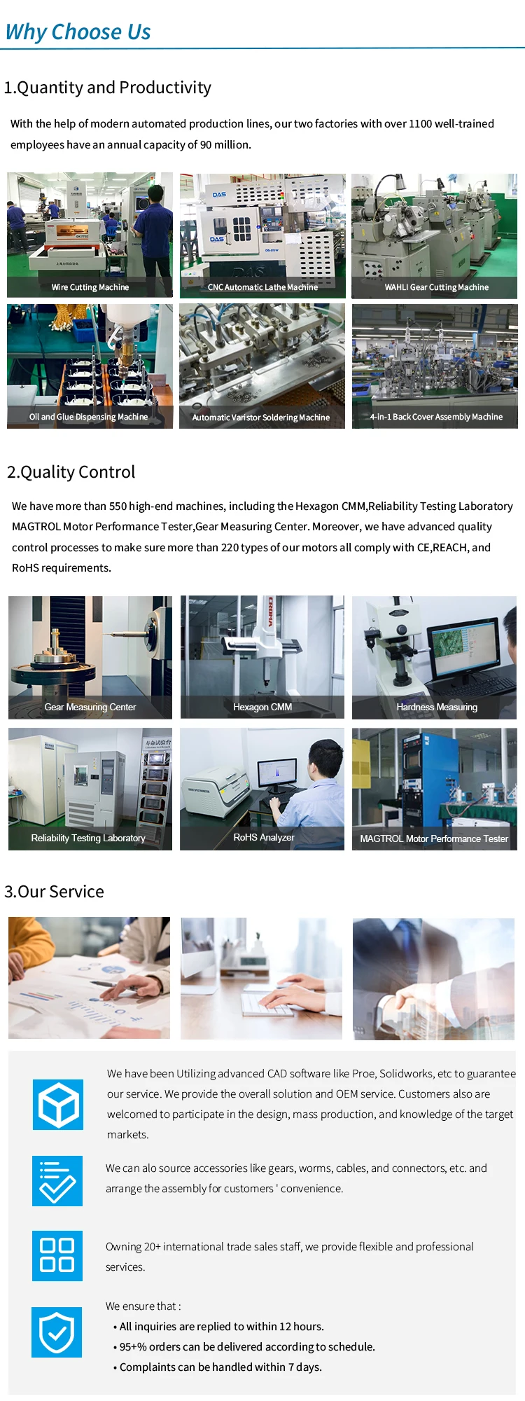 Normally, it takes 15-25 days to produce samples; about mass production, it will take 35-40 days for DC motor production and 45-60 days for gear motor production.