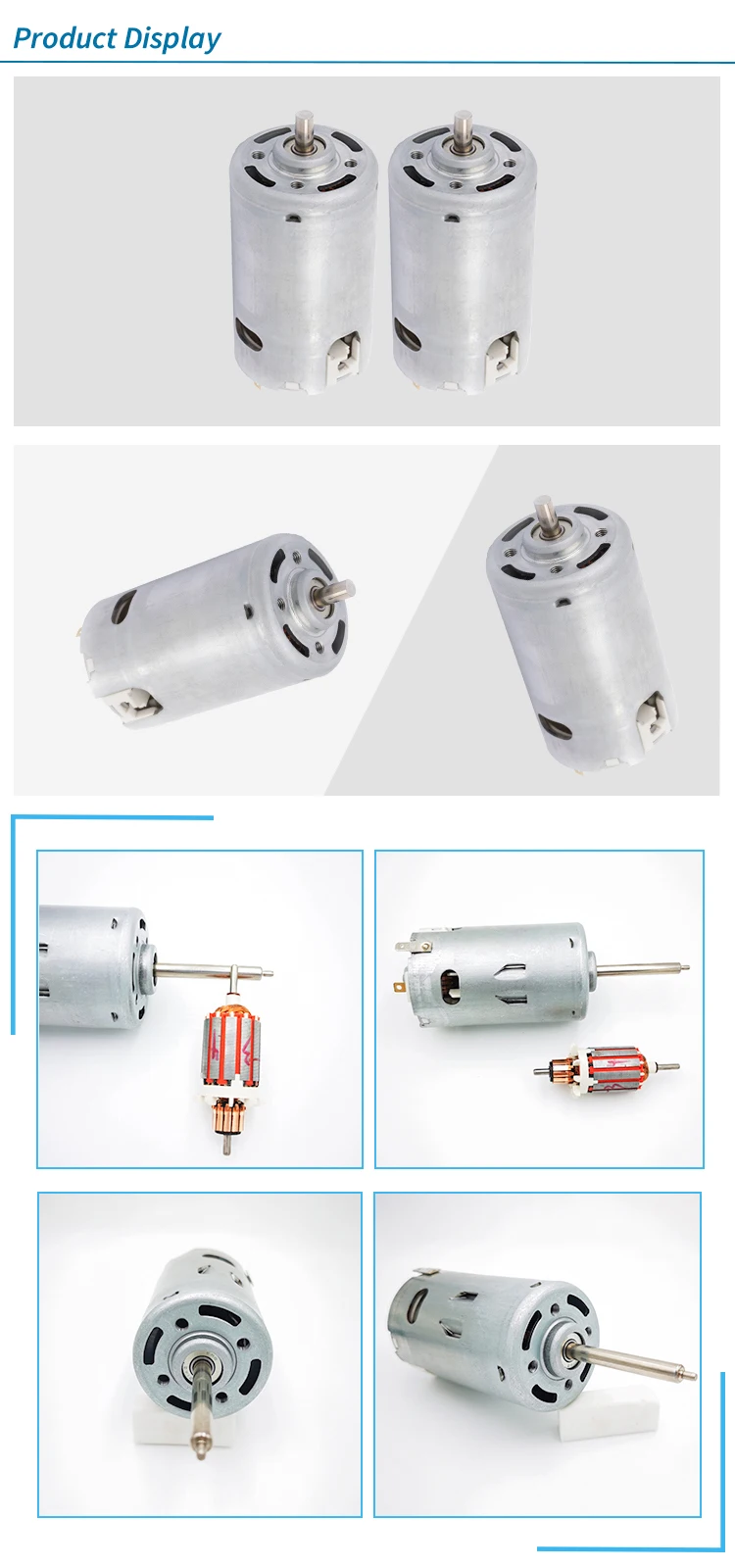 Kinmore specializes in making DC motors & gear motors with the diameter ranging from 6mm-80mm; automotive motors and vibration motors are our strength area, too; we also provide brushless motors.