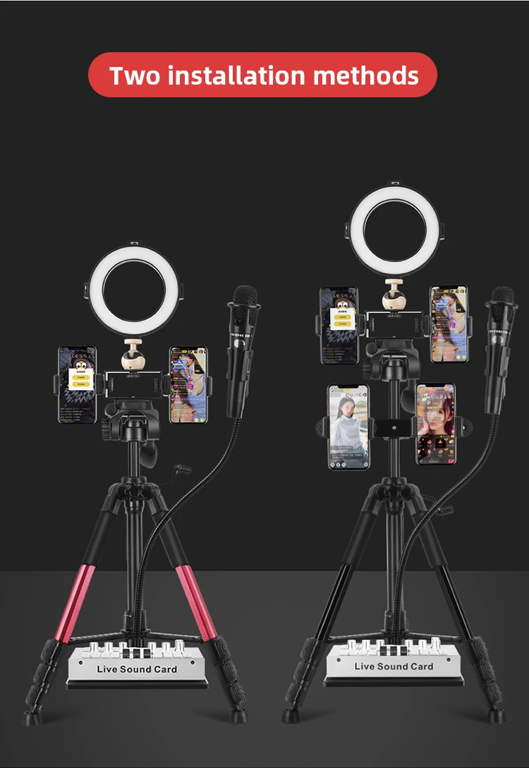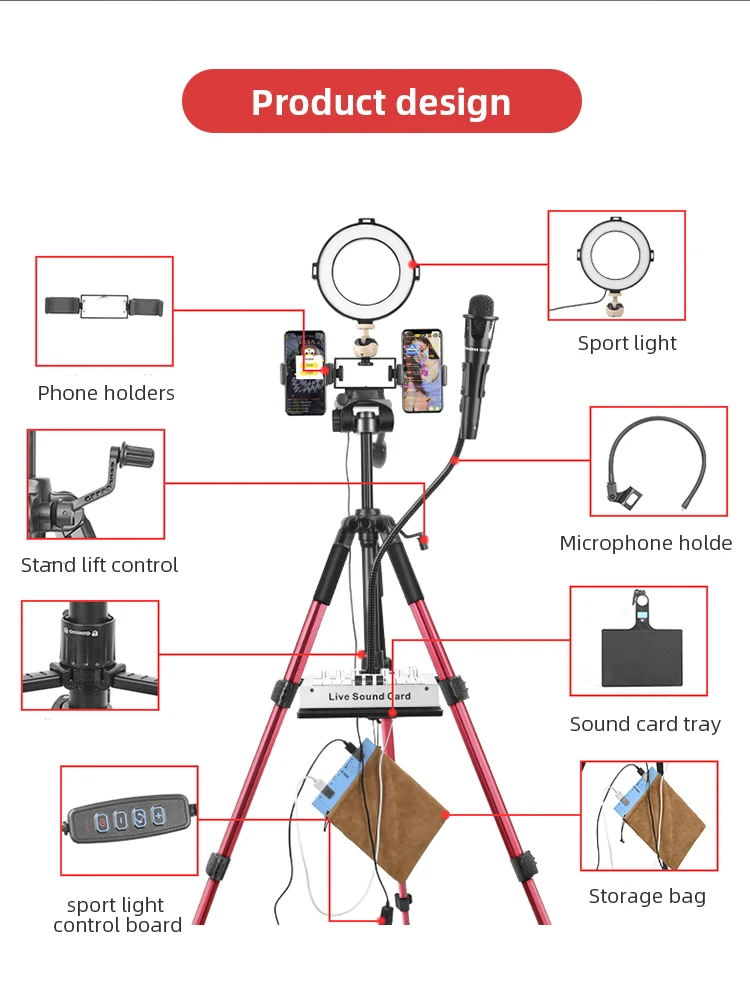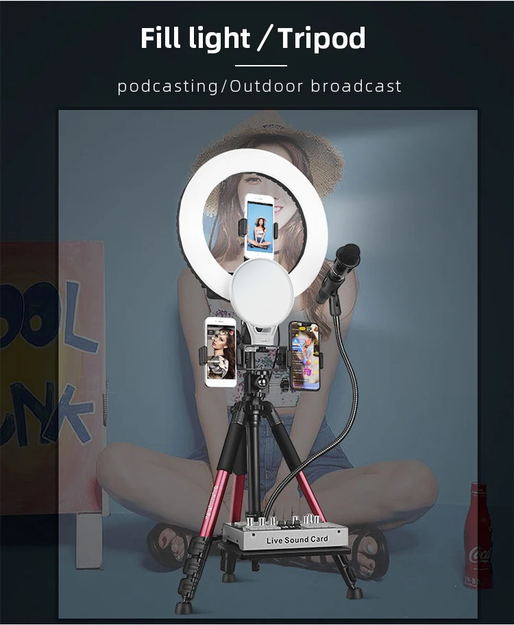 LED lights, Cell phones, sound Card, and Microphones combine to make you a professional live streamer