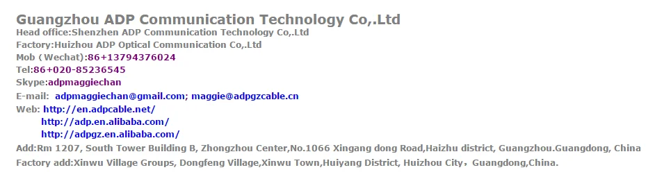 Huizhou ADP Cables Co., Ltd is a professional designer and high-tech manufacturer of network cable and fiber optic cable. Our mod-ermined company introduces advanced full set of production lines and testing equipment, in order to meet the various markets demand as customer’s required. Our main products are high-tech cables, including fiber optic cable, fiber optic patch cord, copper cable, CAT5E and CAT6 computer cable, large number pairs cable, telephone cable, USB cable, and other relative network accessories. Our company has a large scale, such as fiber optic factory, cable and wire factory, copper and aluminum factory, PVC factory and PE factory. Our factory covers 20000 square meters. Our company has introduced a group of professionals, who specialize in researching, production and management. We can accurately deliver the ordered products to various countries’ ports around the world as soon as possible. Our people-oriented supplier has won domestic and international customers’ highly appreciated and intimate trust for further cooperation, because of our high quality, low price and faithful service.