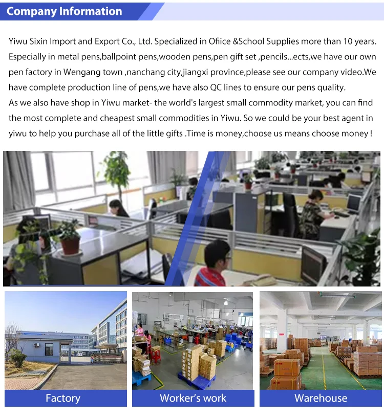Yiwu Sixin Import and Export Co., Ltd is a company specialized in Office & School Supplies more than 10 years,we have our own shop in yiwu Futian Market. 90% of our products have in STOCK and low MOQ (some of them even in ONE piece and low shipping cost ). When you take order of more than 3-5pieces, maybe free shipping. We provide customers with a one-stop shopping platform with different merchandise which saving more time and more money for you. So,choose us means save time and money !