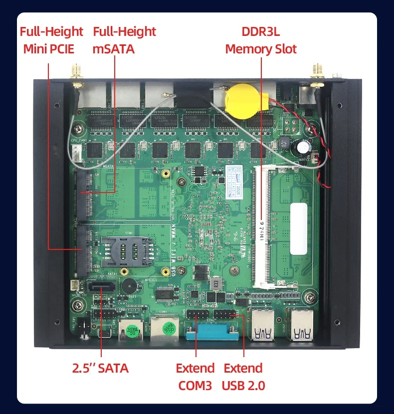 Extend Slot | 1*Full-Height MINI PCIE WIFI/3G,4G Module 1*2.5'' Hard disk | ||||||