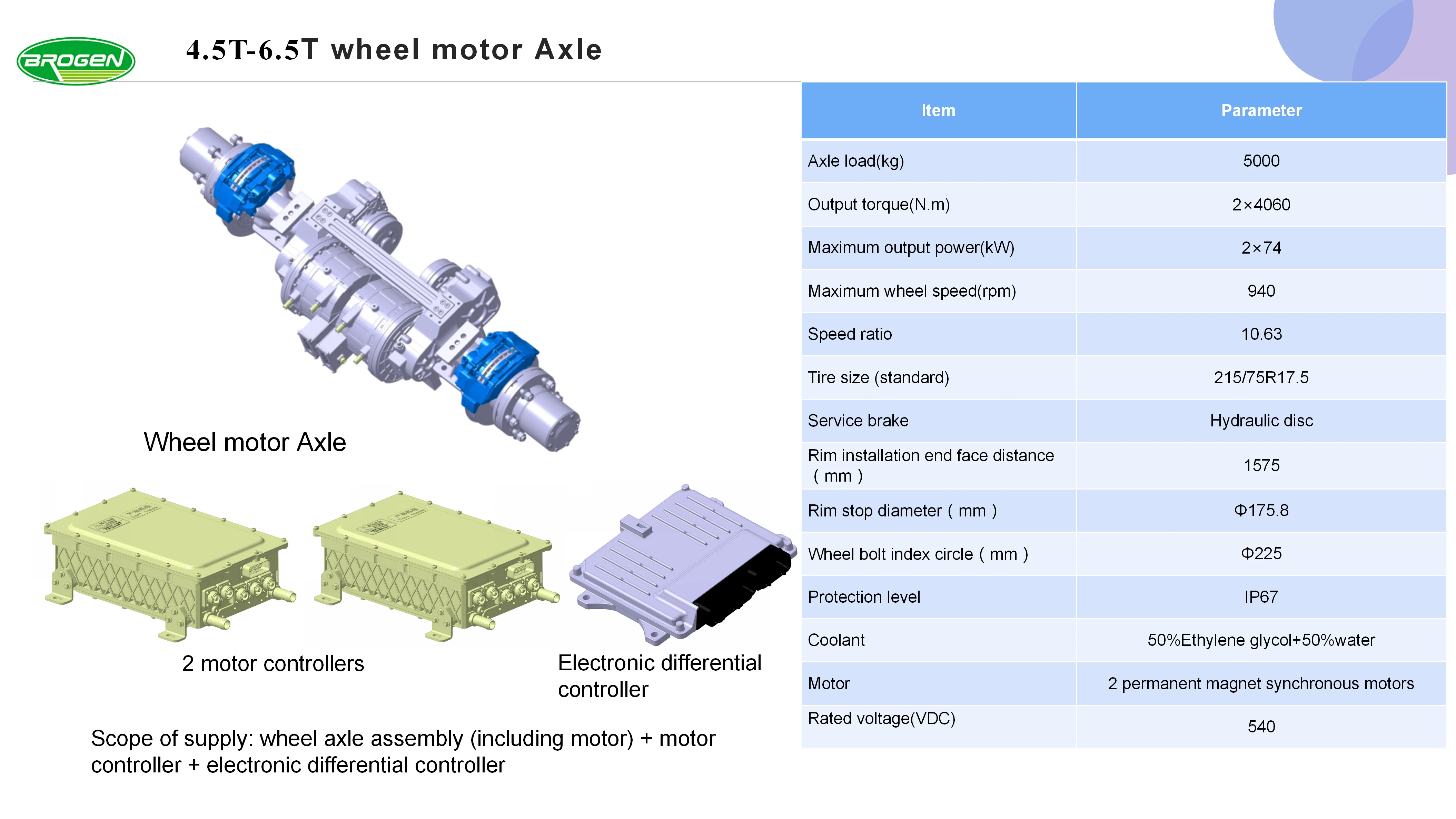 Axle load(kg) | 5T | Peak power | 2×74kw | |||