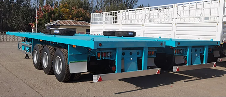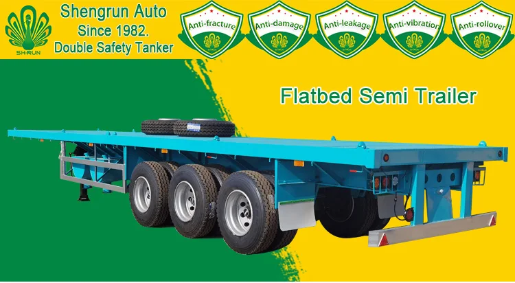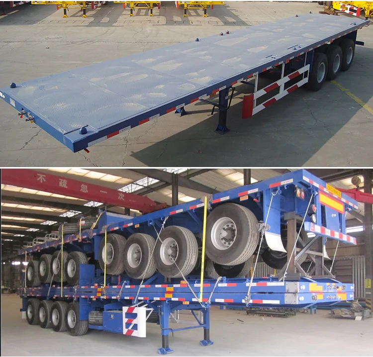 Flatbed trailer as known as flatbed container trailer. This trailer can carry loose cargo, Pipe, 20/30/40/45 feet Container. There are 40 ton – 100 ton loading capacity for your choose.