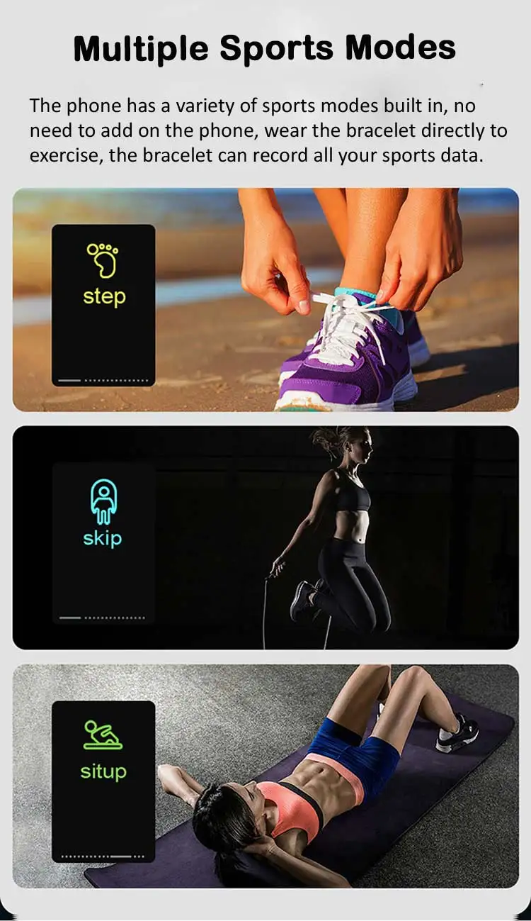 Main function:HD 0.96 color screen, colorful UI, heart rate monitoring, blood pressure monitoring, step counting, calories, distance, sleep monitoring, sports mode, call reminder, alarm reminder, hand-on bright screen, social sharing (WeChat, QQ, Facebook, Twitter), etc.