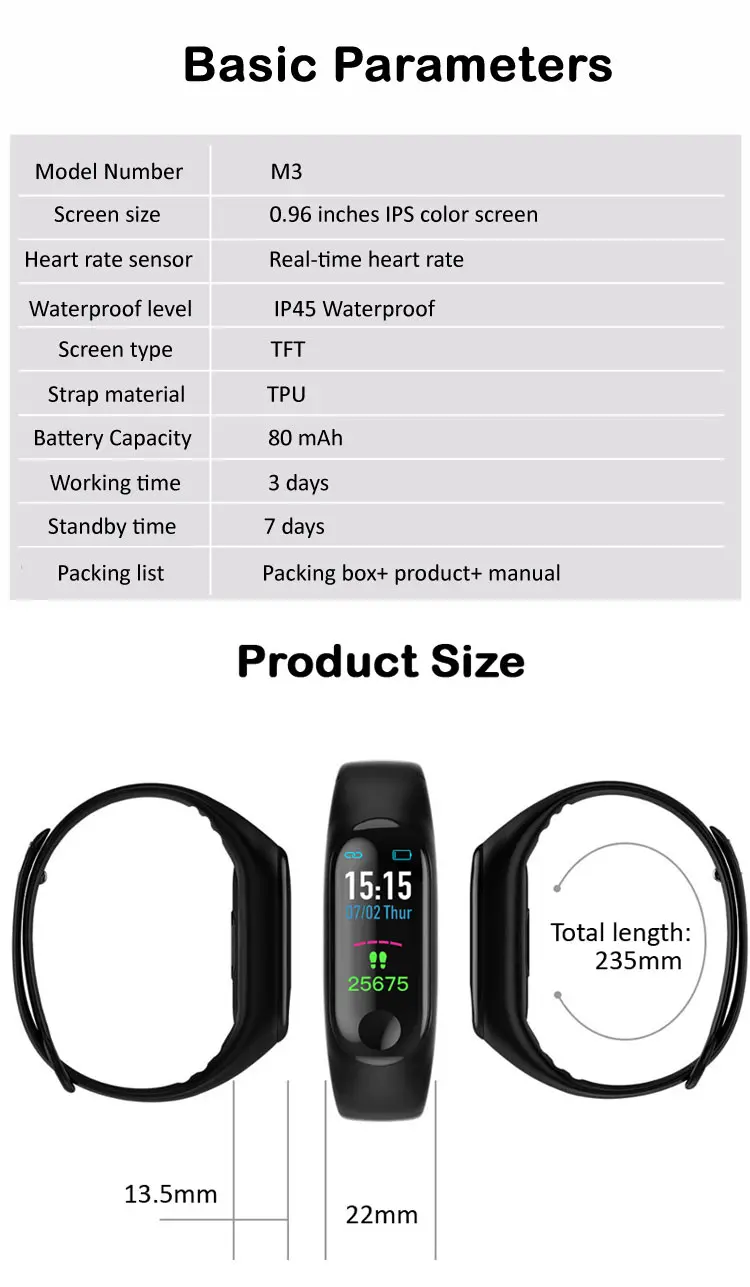 | Product model: | M3; | Bluetooth: | 4.0BLE (low power consumption); |