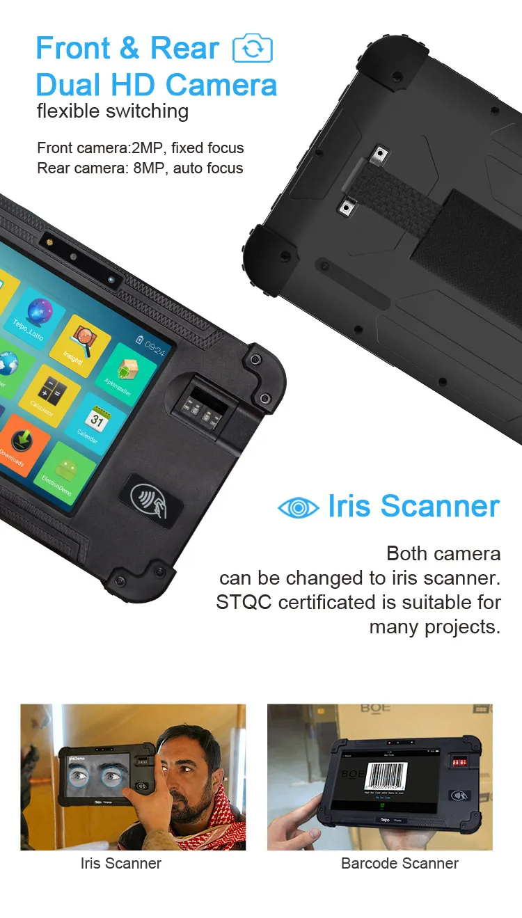 | Rear Camera(Optional) | 8MP, auto focus(Barcode software decoding) Can be changed to Iris scanner (2MP) |