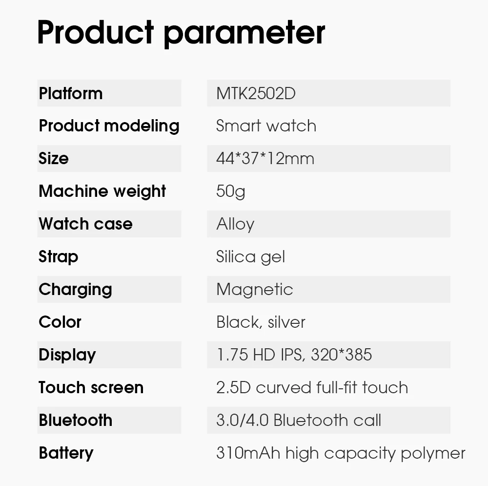 | Function: | Pedometer,Calendar,Alarm Clock,Remote Control,Fitness Tracker,Small Second,Calculators,Passometer,Call Reminder,Answer Call,Mood Tracker,Dial Call,Heart Rate Tracker,24 hour instruction,Blood oxygen monitor; | Battery capacity: | 310mah; |