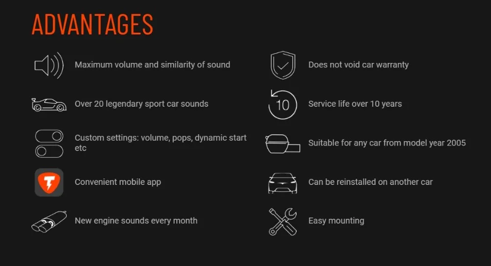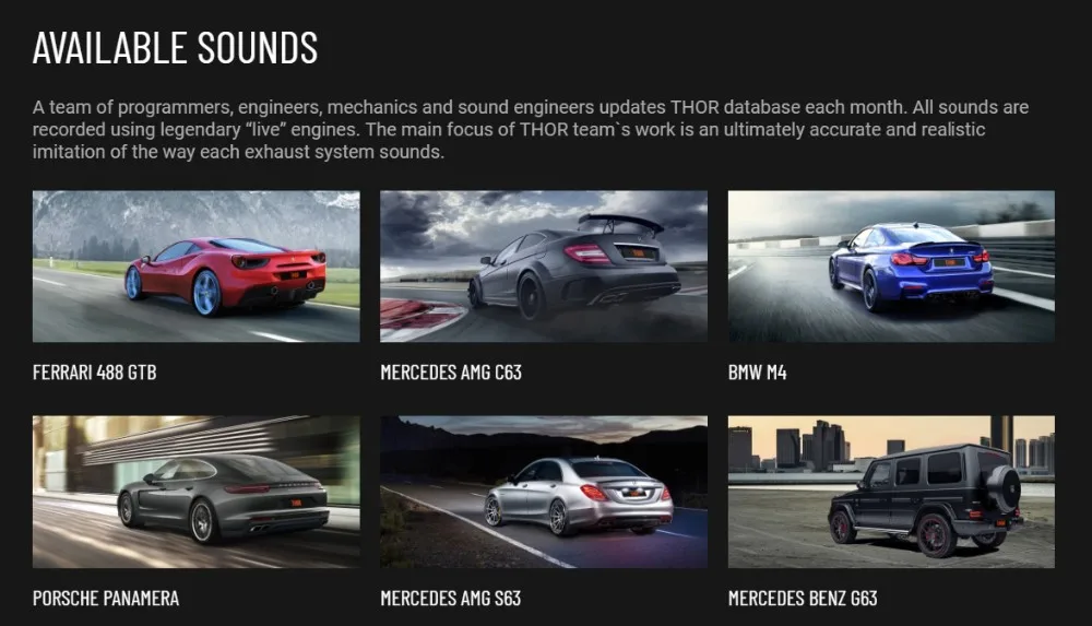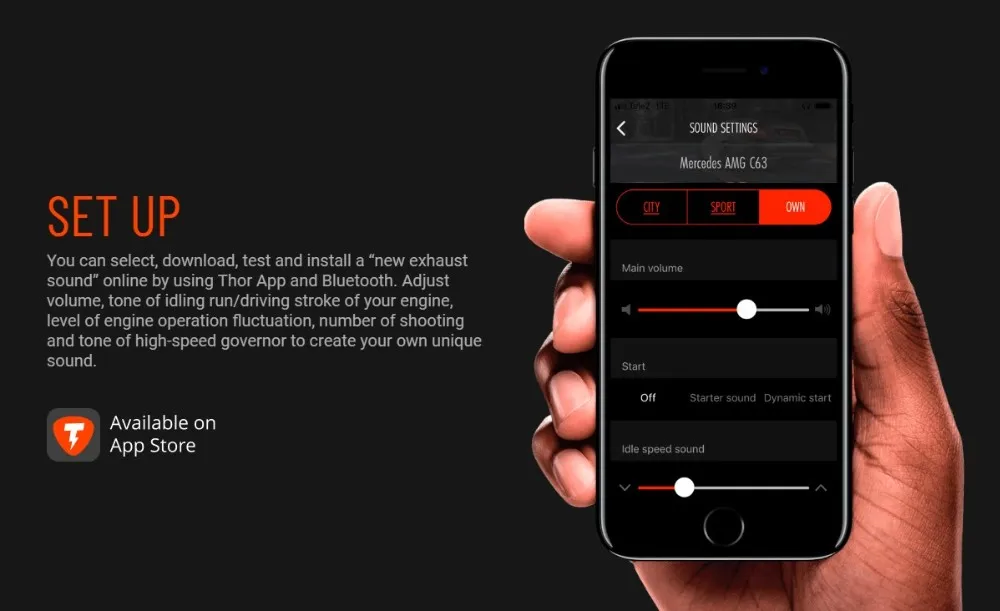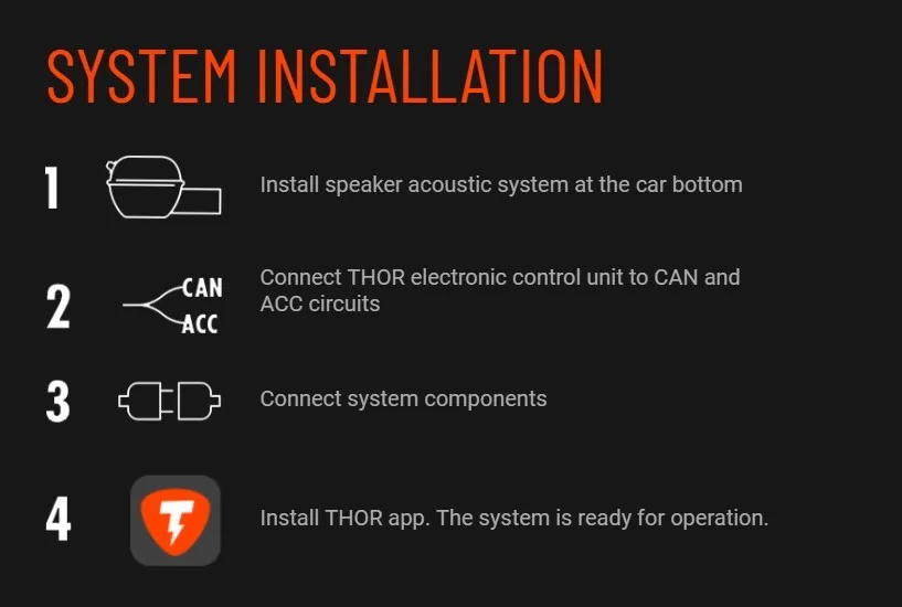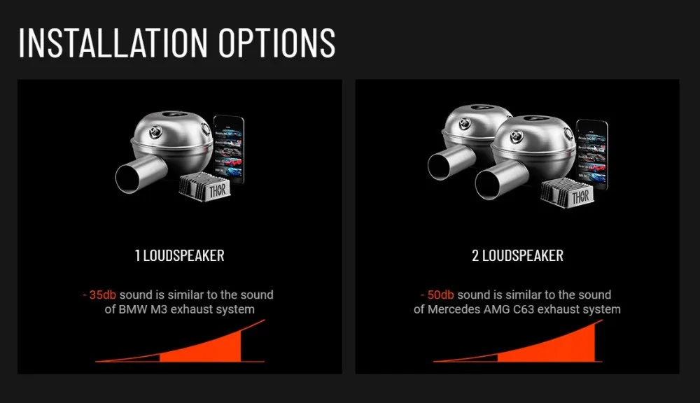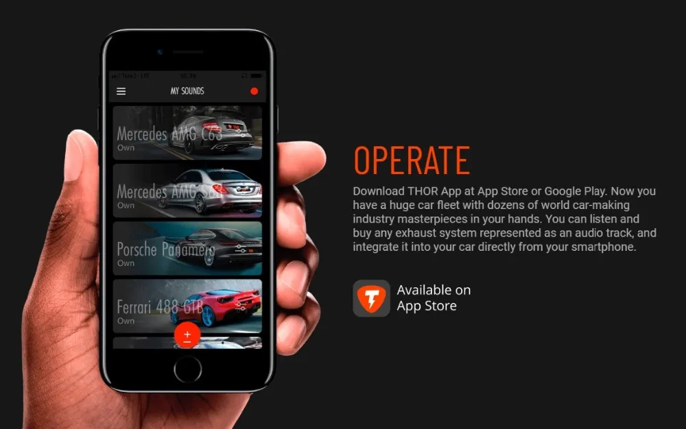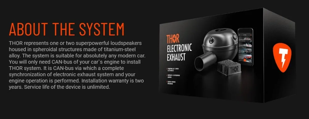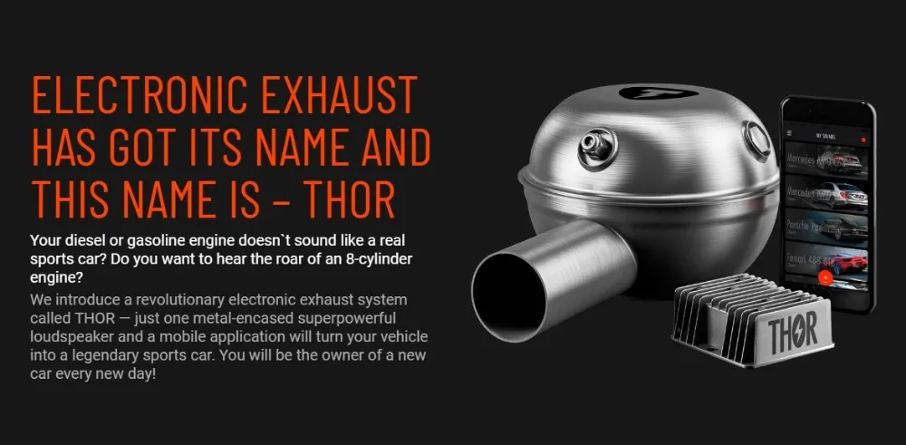We introduce a revolutionary electronic exhaust system called THOR - just one metal-encased superpowerful loudspeaker and a mobile application will turn your vehicle into a legendary sports car. You will be the owner of a new car every new day!