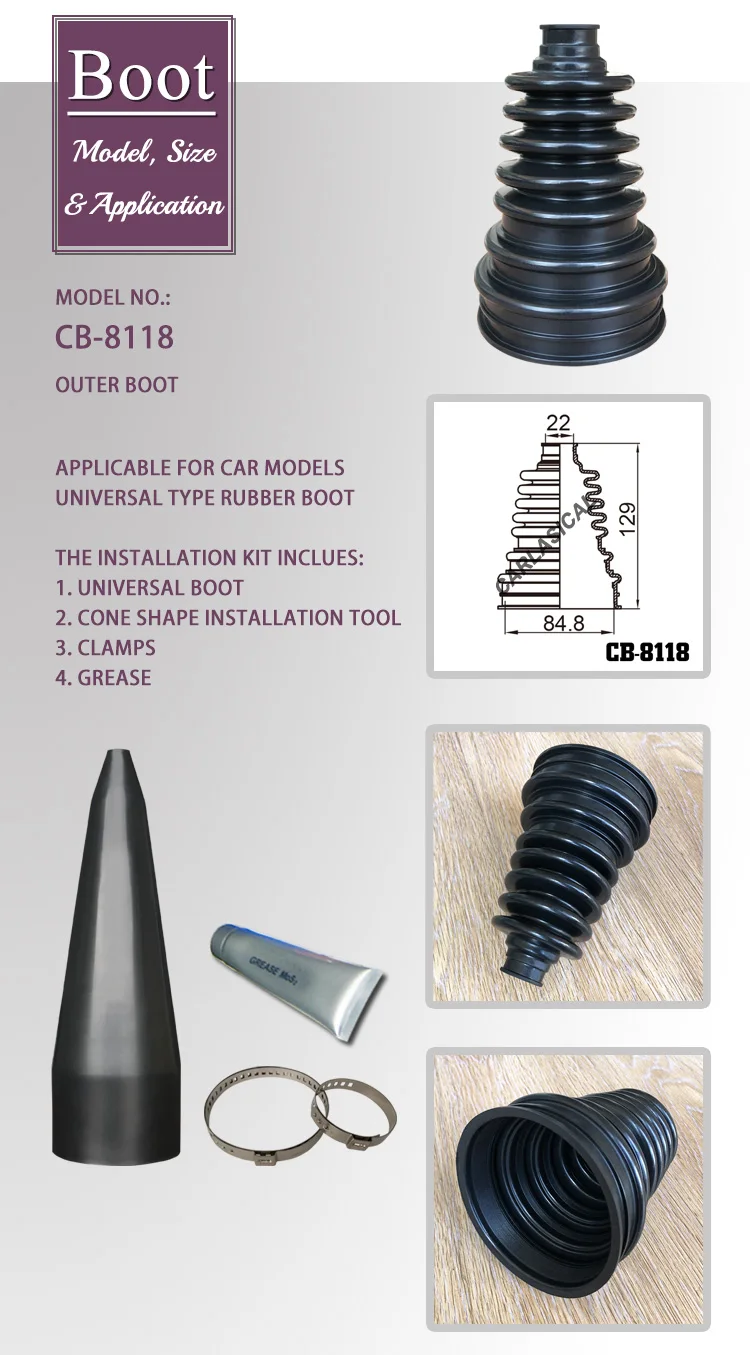 1. Universal boot cuttable to different shape and size, suitable for majority of outer CV joint. One boot covers many car models.