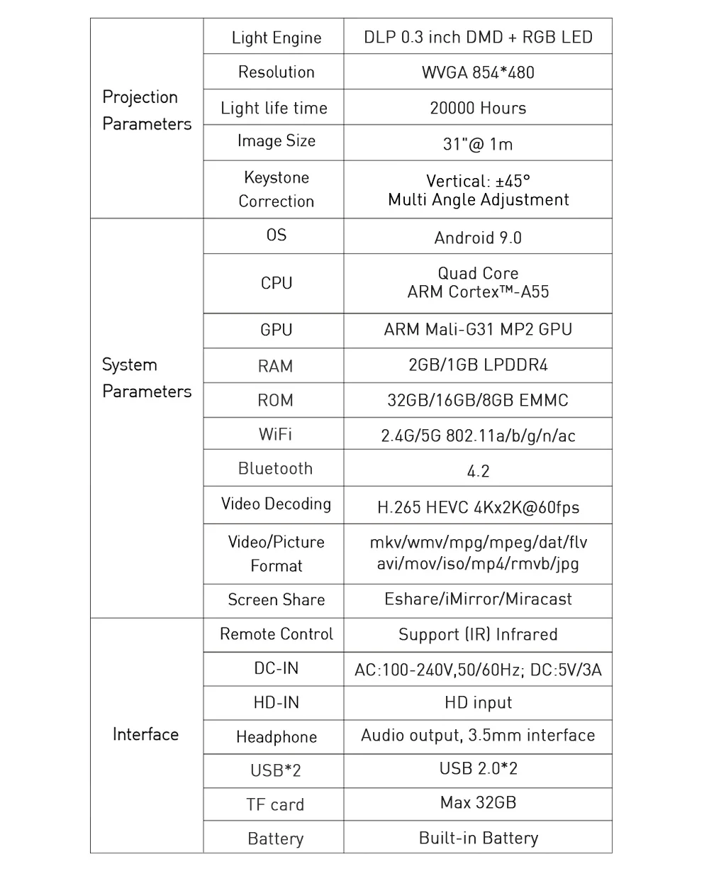 | Lamp: | LED; | Feature: | Pico,3D ready,3D Built-In,Internet Built-In,Built-In Speakers,Build in Android 9.0; |