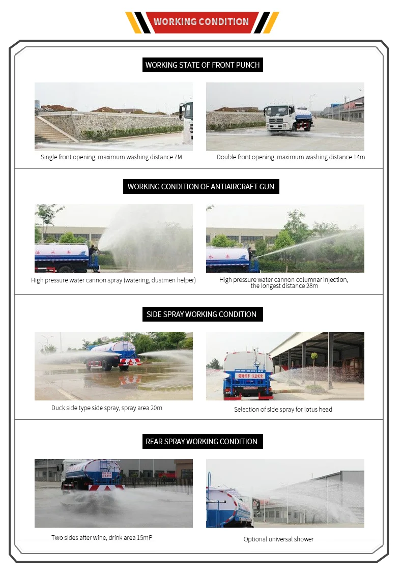 4,With the functions of spraying, pressing dust, high-low position spraying, and flushing guard bars and barrier belts.