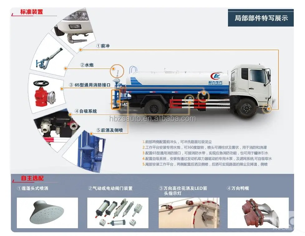 1,The water tank truck adopts chassis for loading, equipped with tanks, loading tank assembly, self-suction pump, power rotation system, piping system and sprinkler assembly.