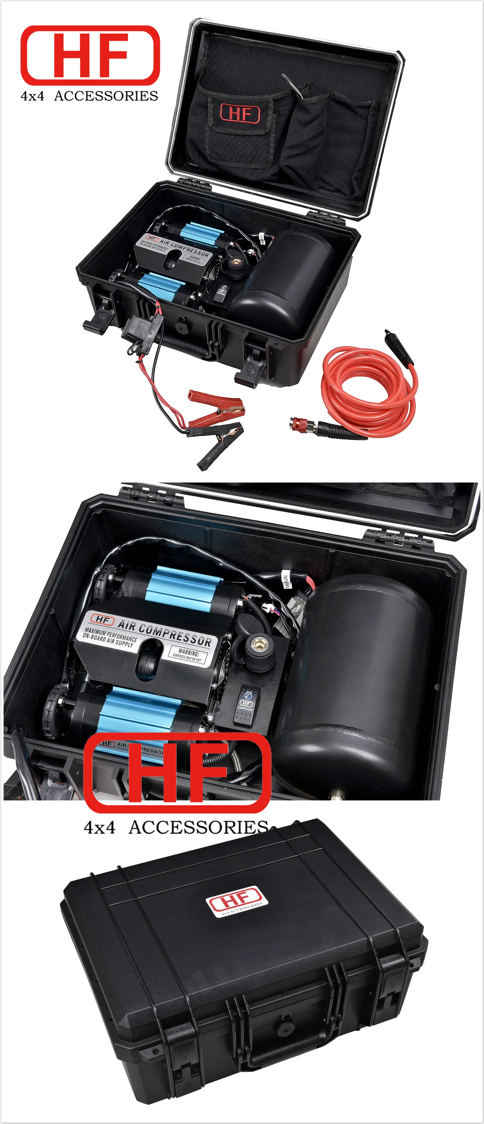 Designed to provide high flow air on demand, HF portable air compressor is the ideal solution for air tools,tire and camping or leisure gear,Its twin motors are internally thermal protected against extreme temperature damage while a heavy duty in-line maxi fuse for each motor provides professional circuit protection,The compressor comes in high quality carry case featuring internal pocket for components and accessories including a 20ft air hose.