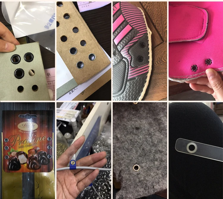 Can use 3mm , 4mm , 5mm ,6mm , 8mm or 10mm size eyelet (metal eyelet) Also we can produce machine according to customer eyelet sampe |
