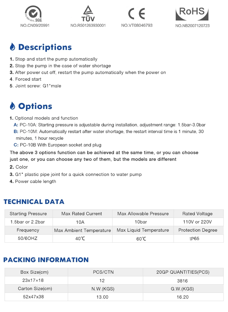 Q1: Are you a factory or just a trading company? A1:We are a manufacturer that specializes in pressure control,pressure switch for more than 30 years. Submersible deep well pump, inverter and inverter pump for more than 10 years. Q2: Is customized service available? A2: Of course, OEM & ODM both are available. Q3: How can I get the quotation? A3: Leave us message with your purchase requirements and we will reply you within one hour on working time. And you may contact us directly by Trade Manager. Q4: How long is the warranty? A4: One year. Q5: I am buying from another supplier, but need better service, would you match or beat the price I am paying? A5: We always feel we provide the best service and competitive prices. We would be more than happy to personalize a competitive quote for you, just contact us. |