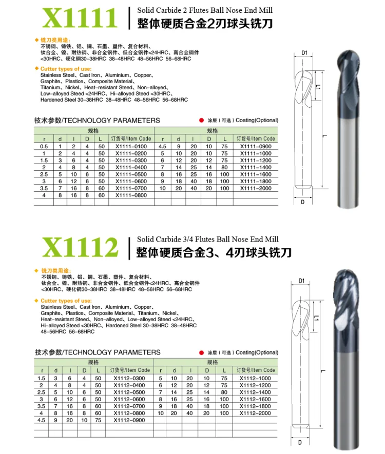 HRC45, 55, 60, 65, 68 | Flat end mill, ball nose end mill, corner radius end mill and aluminium processing end mill |