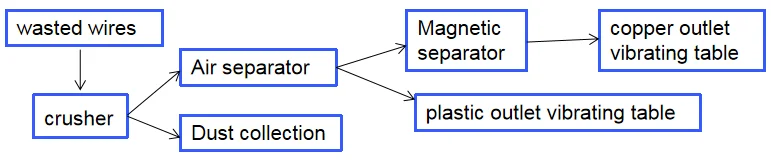 1.Feeding wires--2.Crusher crush the wires in small granules--3.Copper plastic granule enter into air sorting system --4.Vibrating table --pure copper /pure plastic.