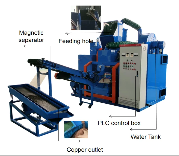 Copper Wire Granulator Machine Structure:BS-D30 copper granulator machine mainly consisted of crusher feeding hole, air separator device , vibrator tab;e, water tank. dust collection, copper and plastic outlet.