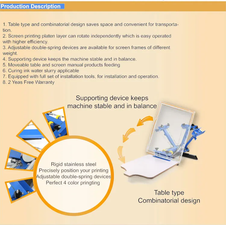 Vertical double rotary bearings, screen plate and table can be rotated separately, do not affect each other, achieve stable and fast color registration.