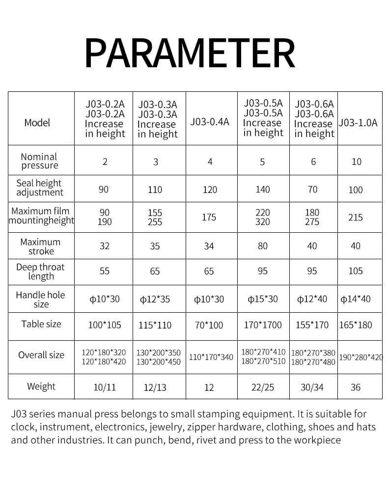 J03 series of manual presses are small stamping equipment for watches and clocks, instruments, electronics, jewelry, hardware and clothing, shoes and hats and other industries, the workpiece can be punching, bending, riveting and press and other processes.