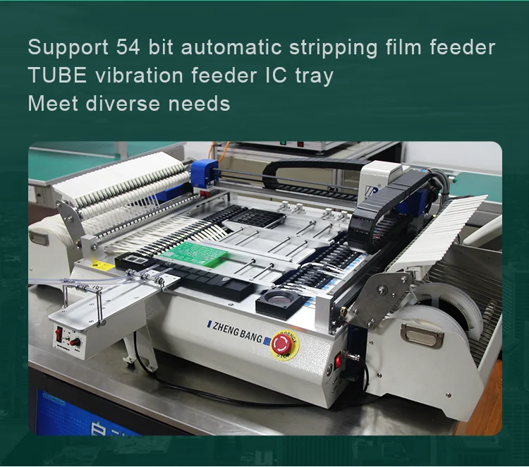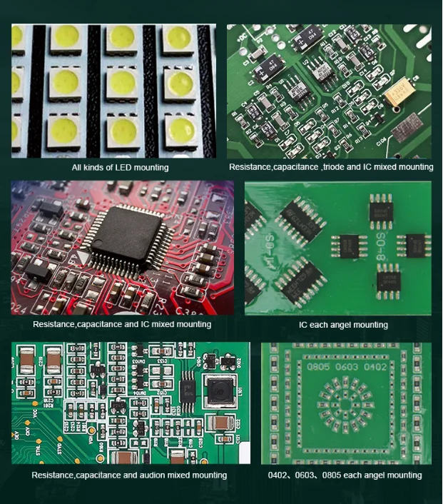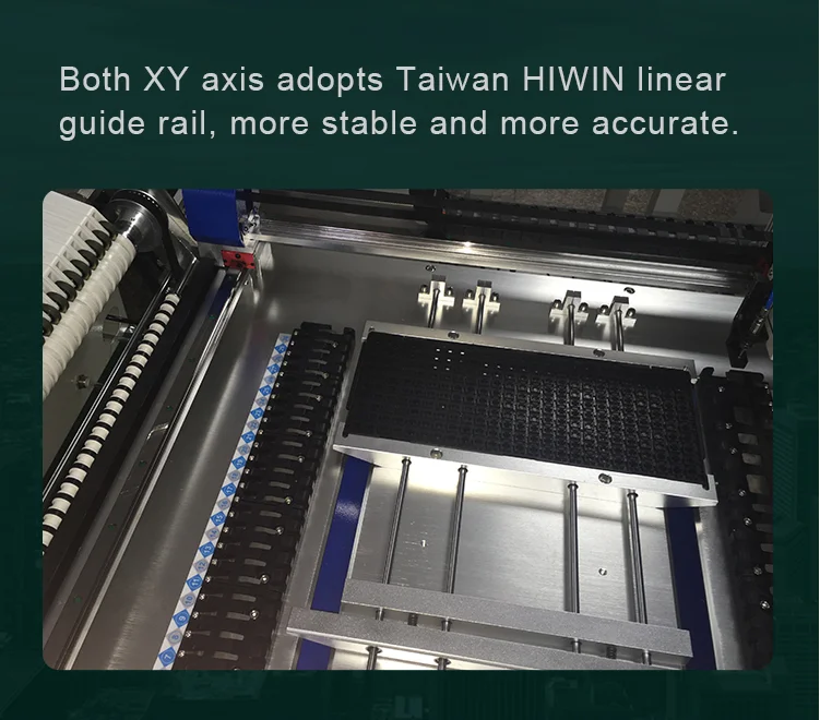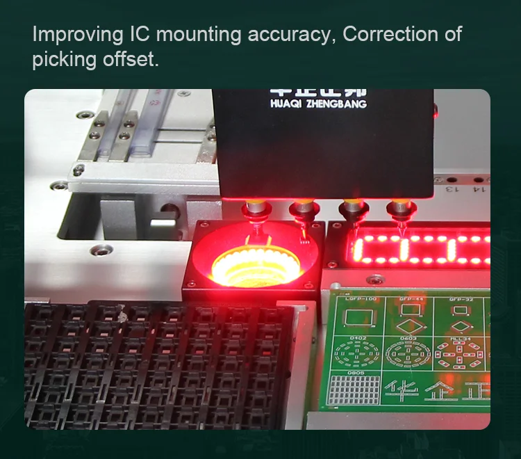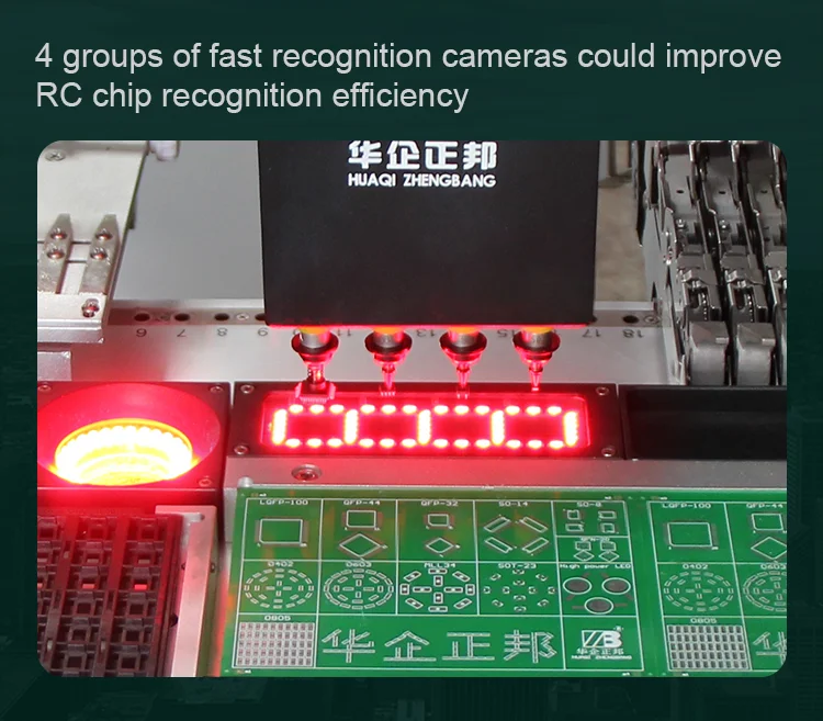 Visual camera: Equipped with 6 pcs of cameras that could effectively mount 0402-5050 components, LED beads, diodes, transistors, SOP, 40mm*40mm range pin pitch ≥0.3mm chip QFP, BGA etc.