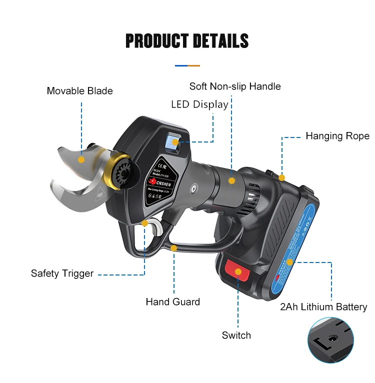 BATTERY: Use 2000mAh rechargeable lithium-ion battery. single battery can work for 3-4 hours, allows workers to prune for an entire work day without ever recharging. with UL,FCC,CE certificates.