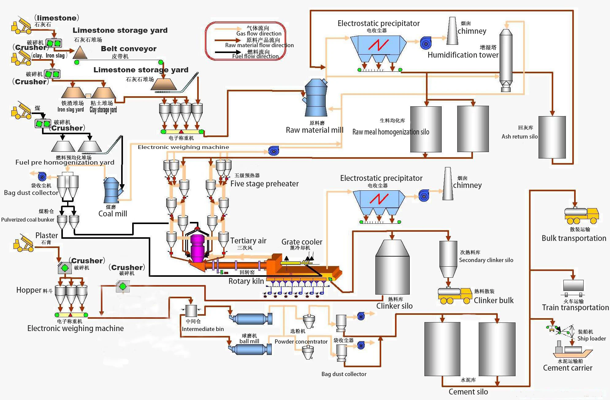 The cement production line (cement plant) is a cement equipment production line composed by a series of equipment. This production line mainly consists of the process of crushing and prehomogenization, raw materials homogenizing, preheating decomposition, cement clinker firing, cement grinding & packaging.